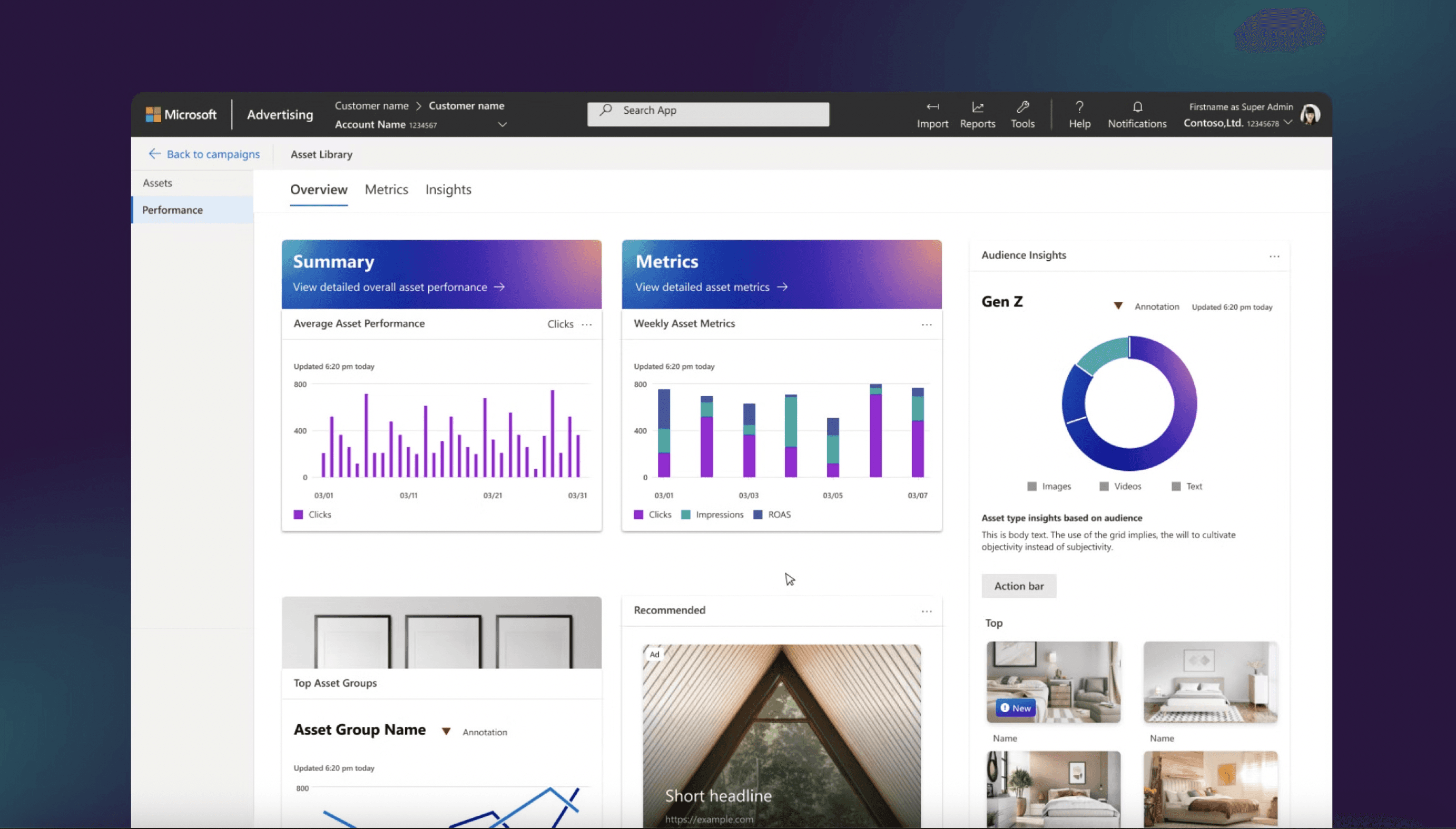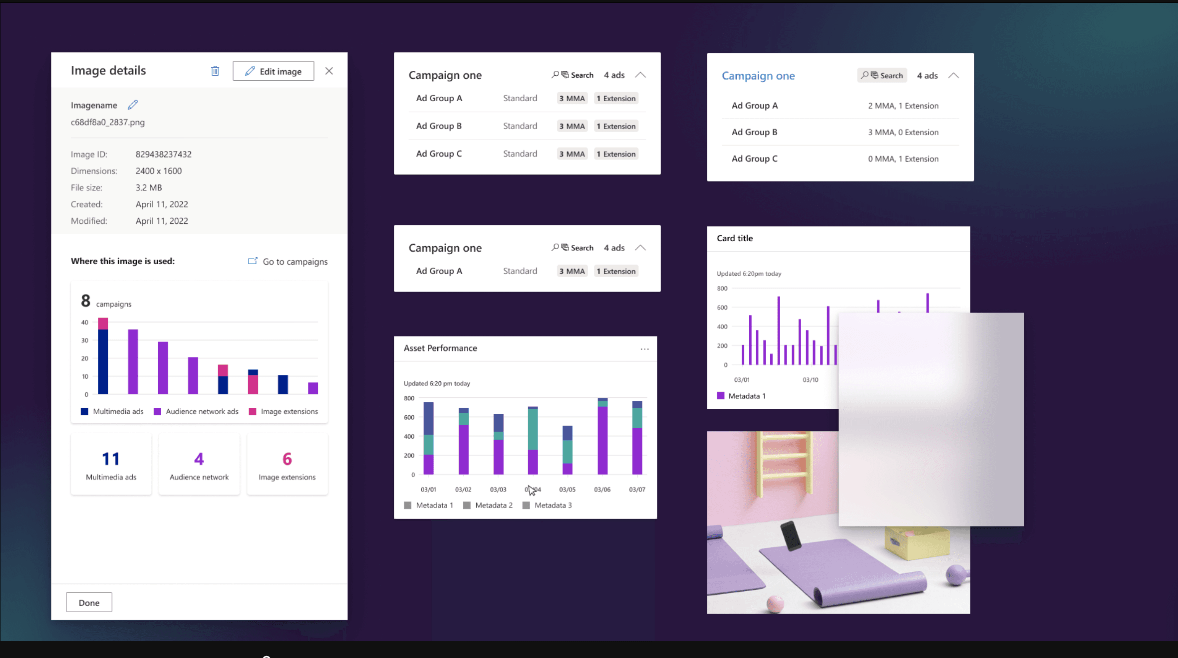 Asset Library I designed the Microsoft Advertising Asset Library — a centralized hub for advertisers to manage, organize, and generate creative assets across campaigns. The core challenge was making a dense, multi-asset environment feel navigable and intelligent. The solution surfaces top-performing assets, cross-links campaign usage, integrates AI creation tools (Copilot, Designer, Smart Effects), and provides recommended actions inline — reducing the friction between insight and action.