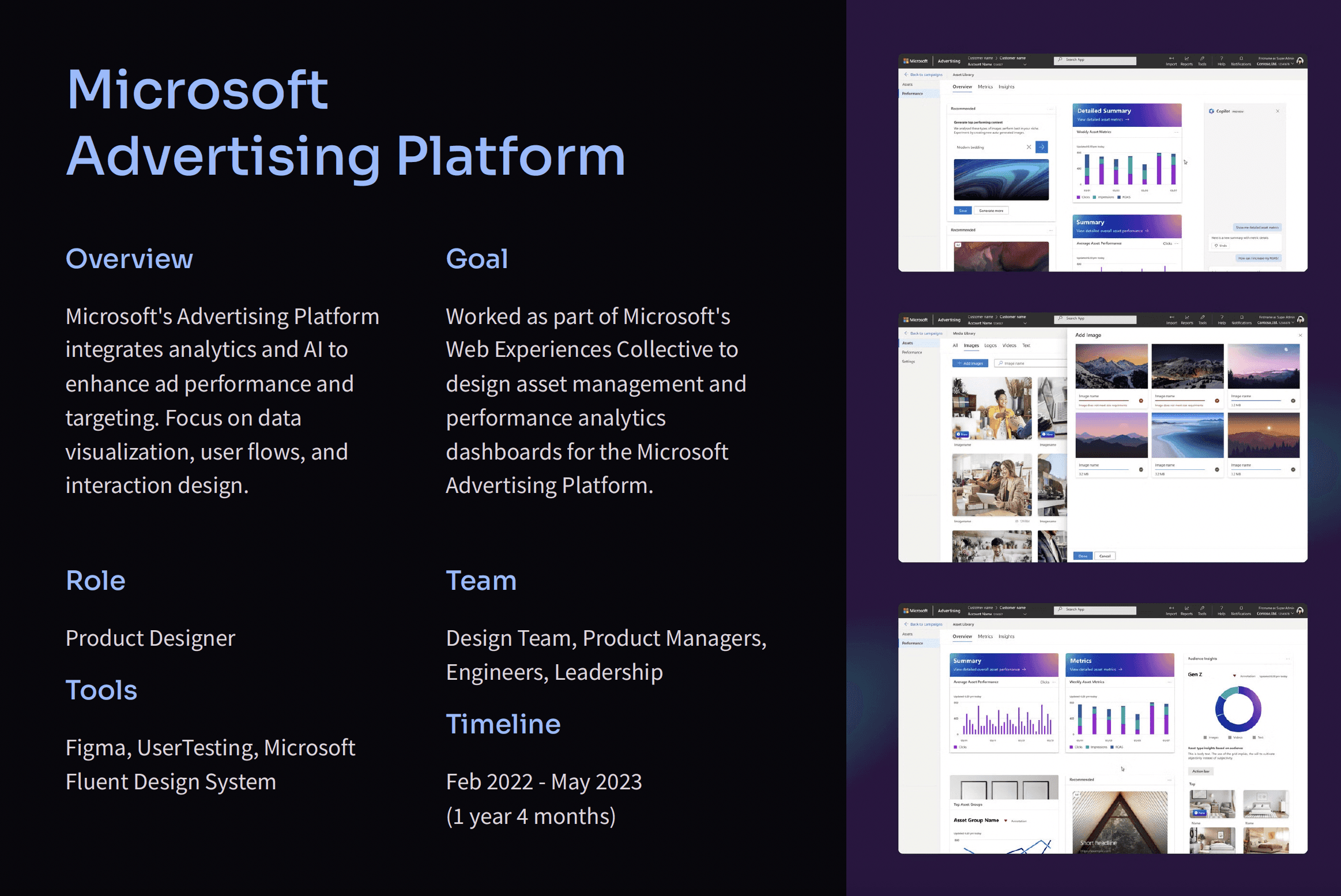 As part of Microsoft's Web Experiences Collective (WXC), I owned product design across the Microsoft Advertising Platform, a B2B SaaS tool used by advertisers to manage campaigns, creative assets, and performance at scale. Work spanned integrating AI features, building data visualization systems, running end-to-end user research, and shipping multiple features from 0 to 1, all within Microsoft's Fluent Design System and in close collaboration with PMs, engineers, researchers, and senior leadership.