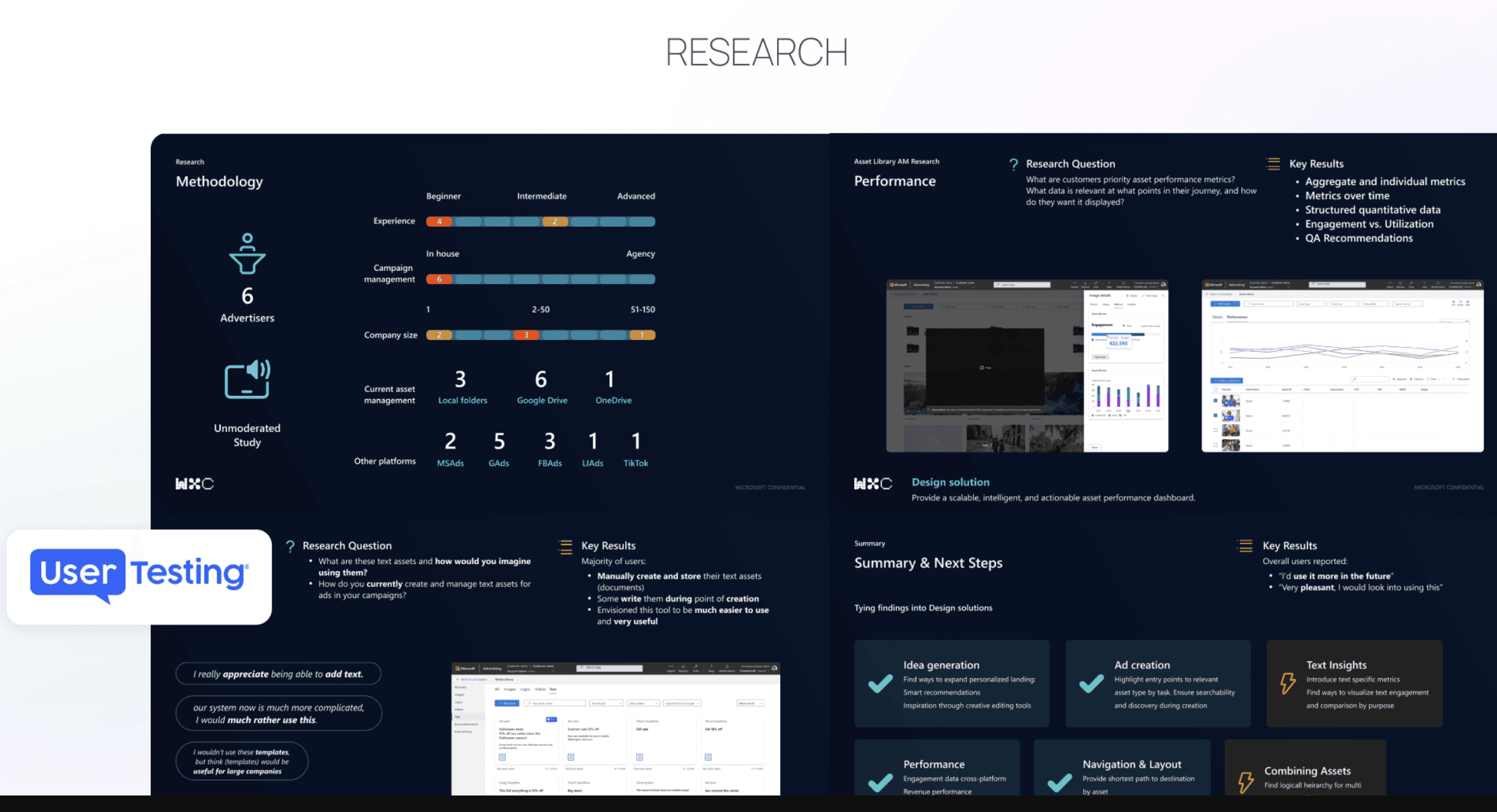 Research That Drove Design Decisions Design decisions were grounded in a rigorous research program. I ran unmoderated studies with 6 advertisers across experience levels, company sizes, and platforms (MSAds, GAds, FBAds, LIAds, TikTok) to understand how they currently manage and measure assets. Key findings shaped the entire product direction: users were manually creating and storing assets, writing text during creation, and envisioning a much smarter tool. From this I defined five design priorities: idea generation, ad creation, performance analytics, navigation/layout, and asset combining — each mapped to concrete design solutions.