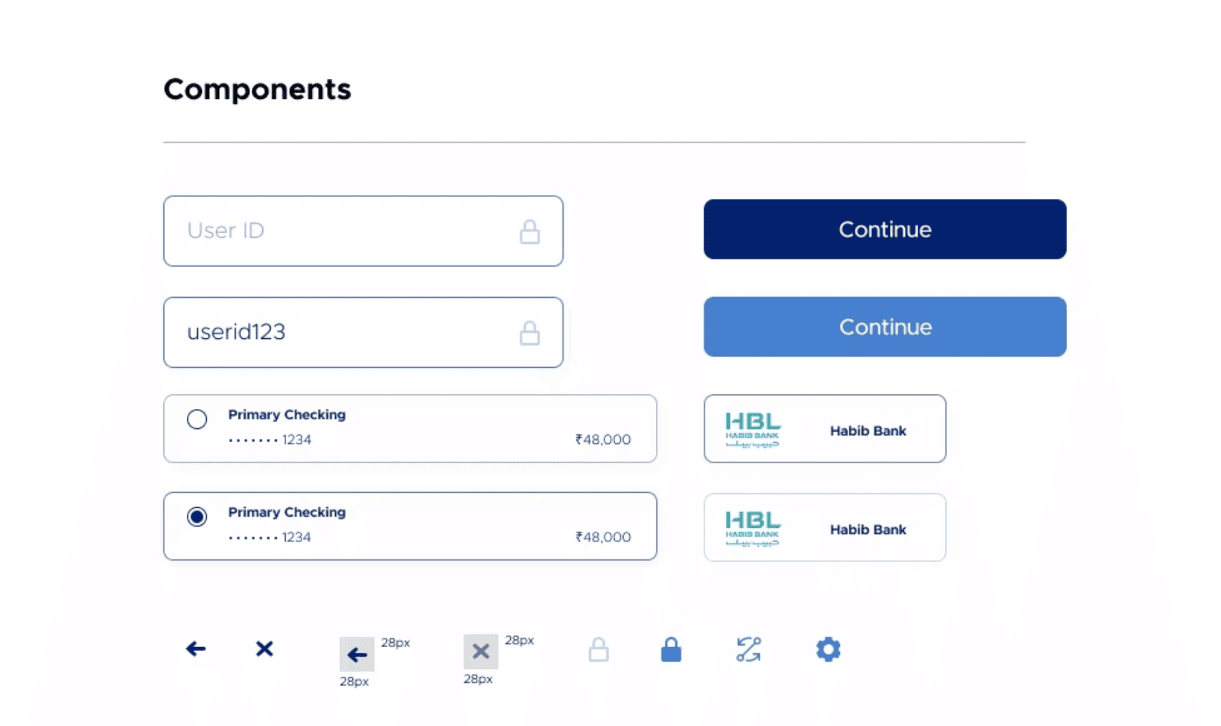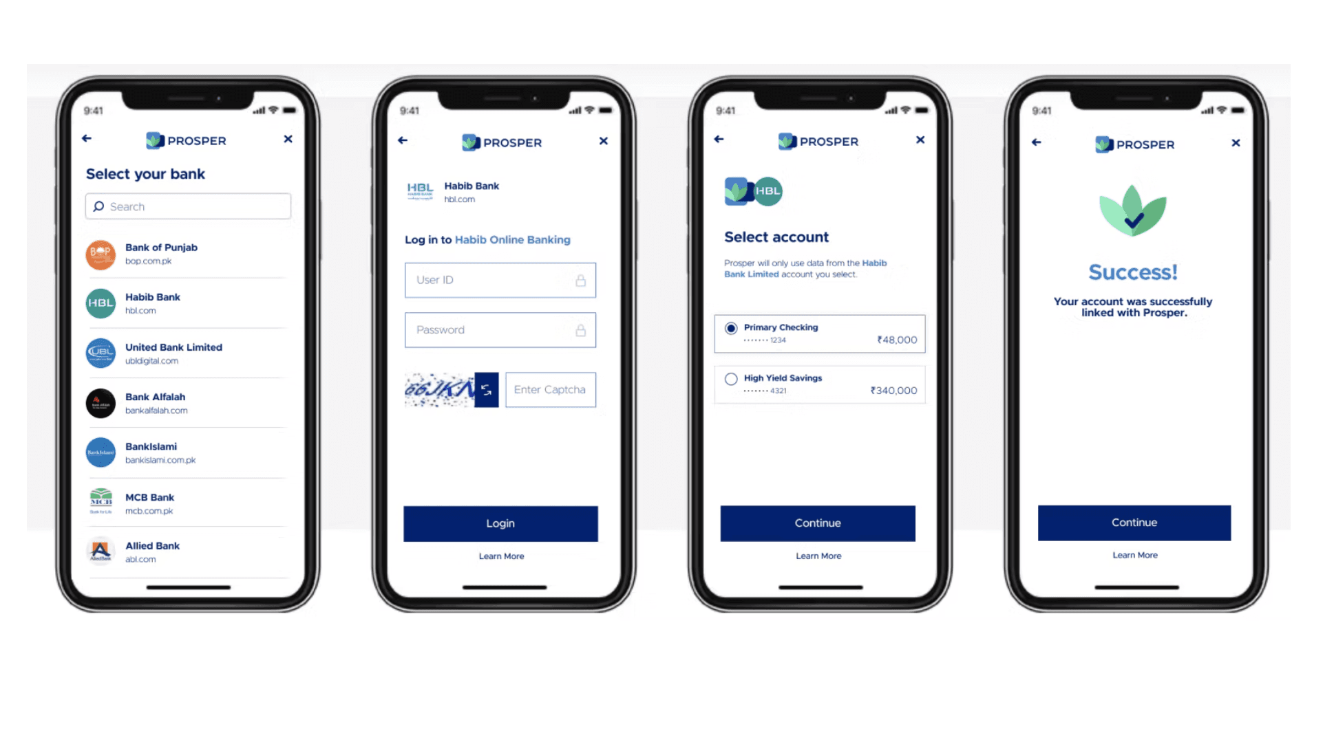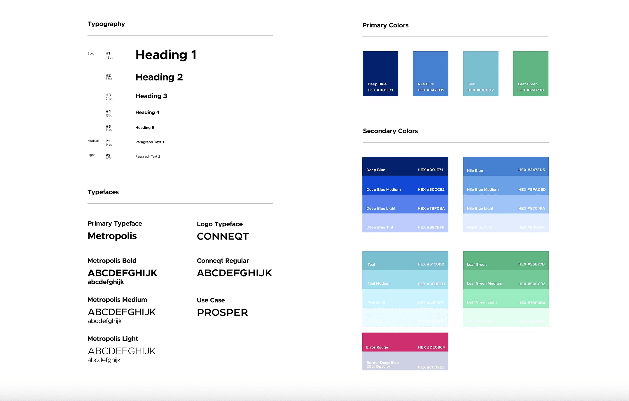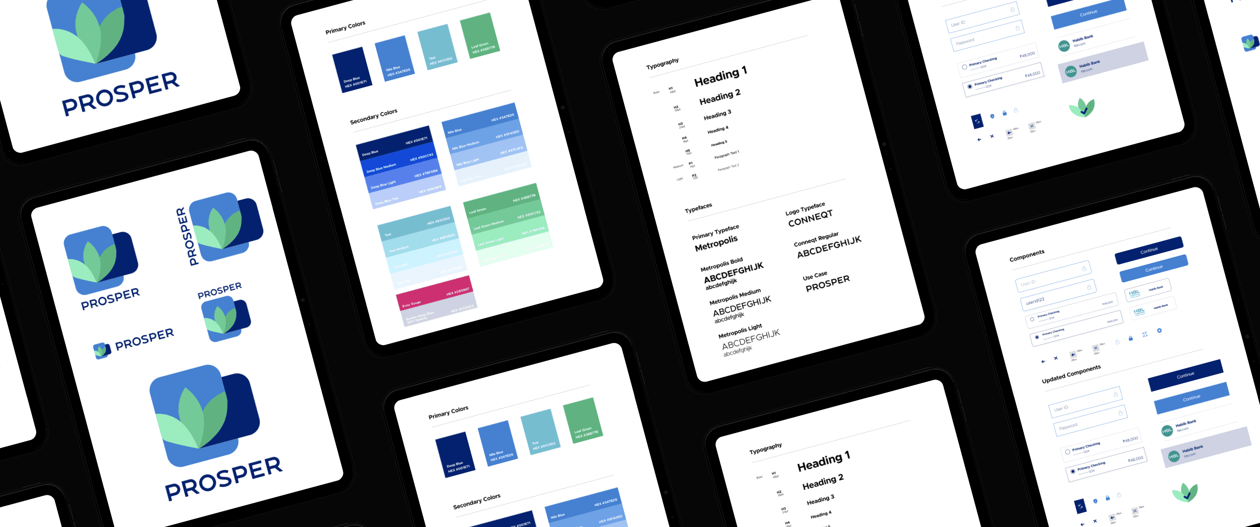 The first order of business was establishing a visual identity that could carry the weight of a fintech product: trustworthy, professional, and scalable. I developed the Prosper brand end to end, covering logo development across multiple variations and logotypes, a color palette built around Deep Blue, Nile Blue, Teal, and Leaf Green to communicate security and growth, and a typography system using Metropolis as the primary typeface paired with Conneqt for the logo mark. Every component — buttons, form fields, cards, error states, loading indicators — was built from scratch and documented in a comprehensive design system ready for development handoff.